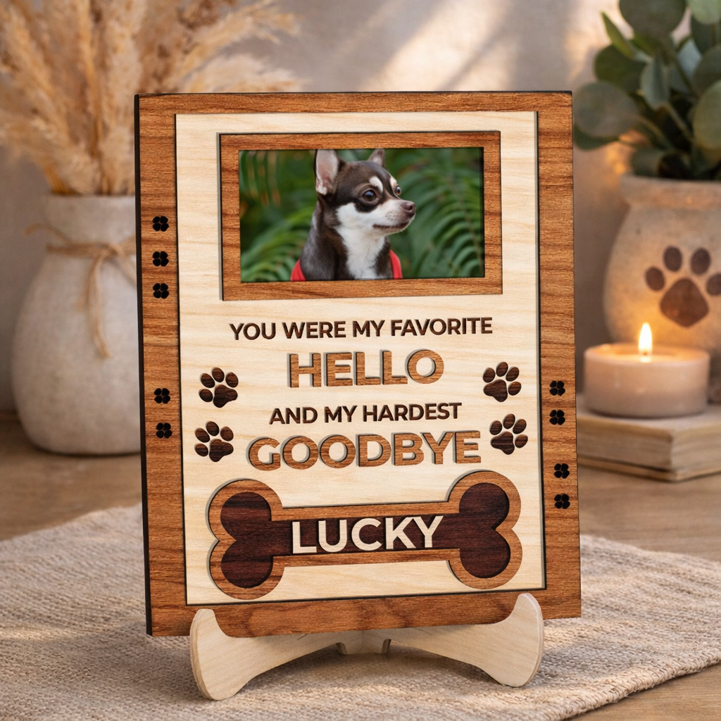 Wooden memorial frame for your favorite photo of your pet with engraved text.