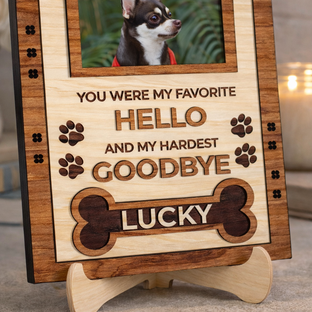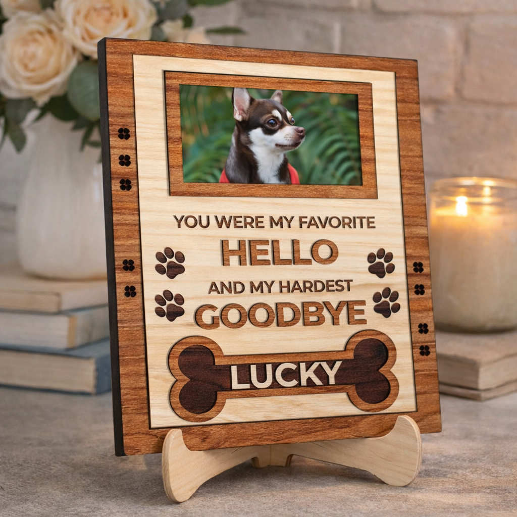 Elegant crafted wooden frame with custom text to cherish your favorite memories of your pet.